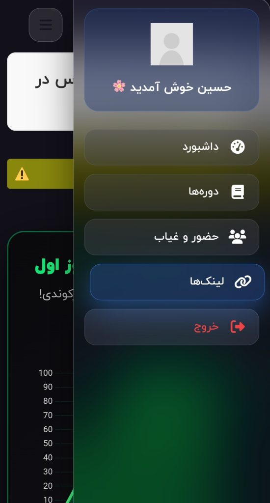 ۳. بعد از ورود به پنل دانش آموز روی سه خط بالا سمت راست کلیک کرده و از منوی کنار گزینه لینک ها را انتخاب نمایید.